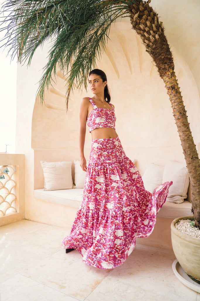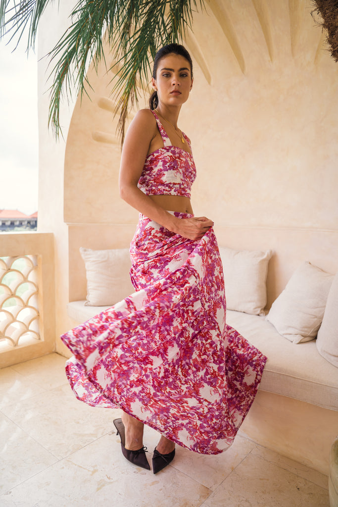 A dreamy two-piece for sunlit sophistication. The crop tank top + flowy skirt dazzle in all-over pink florals, blending playful charm with effortless grace.