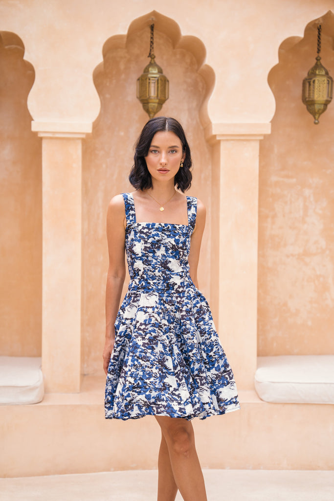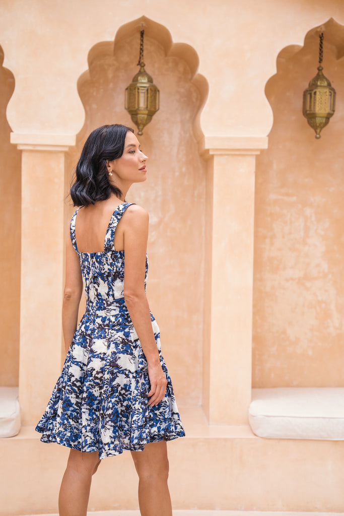 A sunlit classic with a clean square neck and playful blue florals. Effortless, breezy, and made for golden summer moments.