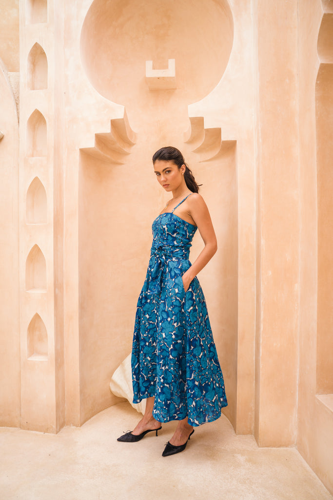 A timeless spaghetti-strap silhouette drenched in deep blue allure. Effortlessly chic, endlessly versatile.
