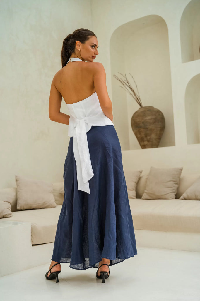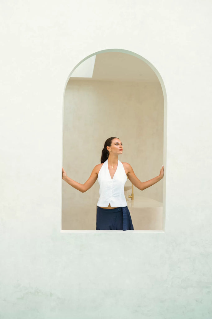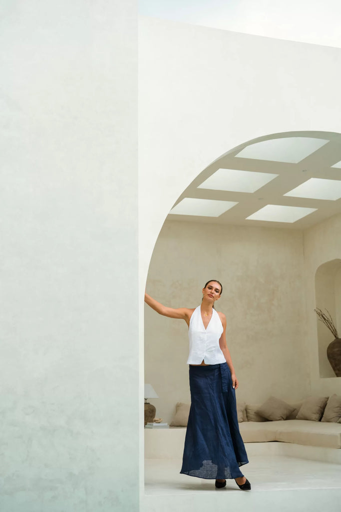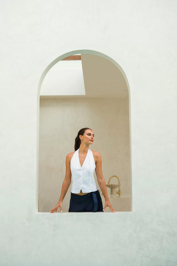 An elegant vest top that accentuates your body shape. Features buttons and ties at the back. 100% Natural Linen