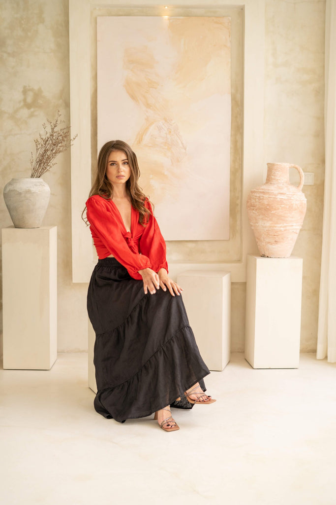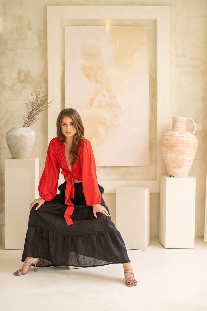 A multi-way top with long puffy sleeves that is crafted in exclusive red color. A piece that will light up your whole look.