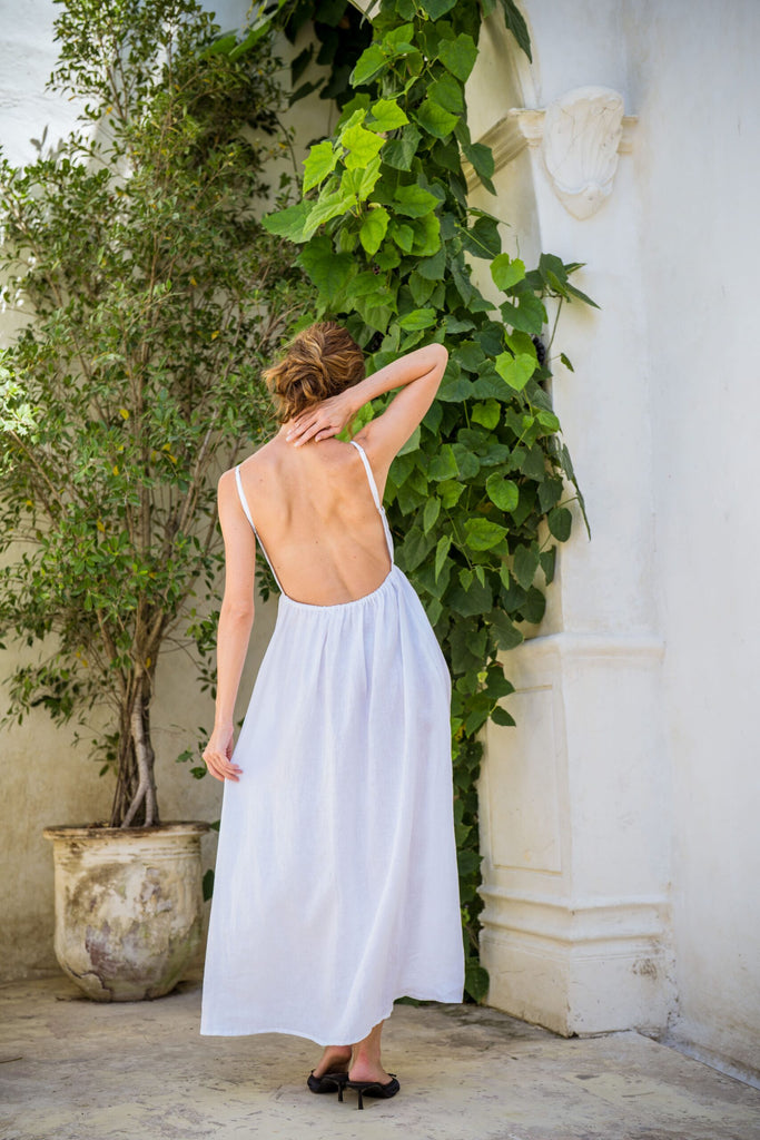 Yasmin Dress features a deep V-neck, elegant flowing design, and scoop open back, blending sexy and sophisticated vibes.